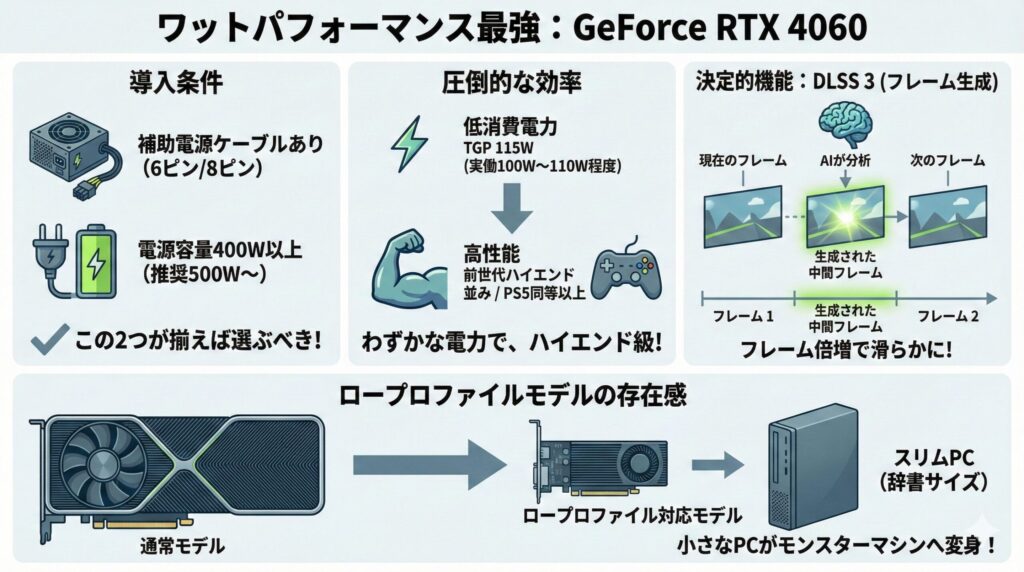 ここからは、具体的に2025年現在、日本の市場で購入可能な「低消費電力グラフィックボード」の主要モデルを個別にピックアップし、その実力を徹底解剖していきます。それぞれの製品には、スペック表だけでは見えてこない「明確な強み」と「致命的な弱点」が存在します。ご自身のPC環境、遊びたいゲーム、そして予算に合わせて、後悔のない一枚を選んでください。