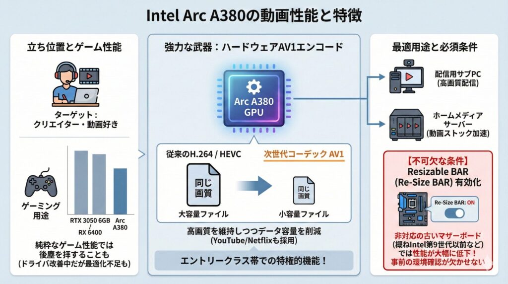ゲームよりも動画エンコード(AV1)や高画質動画再生を重視するユーザー向け。Re-Size BAR対応環境が必須。