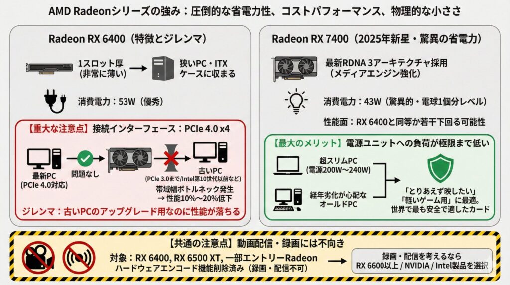 RX 6400およびRX 6500 XT、そして一部のエントリーRadeonには、ハードウェアエンコード機能(ReLive等での録画・配信に使う機能)が物理的に削除されています。ゲームプレイの録画や配信を考えている方は、RadeonならRX 6600以上、あるいはNVIDIAやIntel製品を選ぶ必要があります。