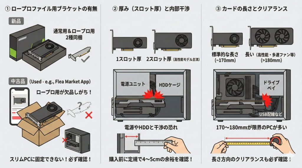 三つ目は「カードの長さ」です。ロープロファイルであっても、高性能なモデルほど基板が長くなる傾向があります。多くのスリムPCでは、長さが約170mm〜180mmを超えると、フロントのUSBポート配線やドライブベイと干渉する可能性があります。特に3連ファンを搭載したような特殊なロープロファイルモデルを選ぶ際は、長さ方向のクリアランス確認も忘れないでください。