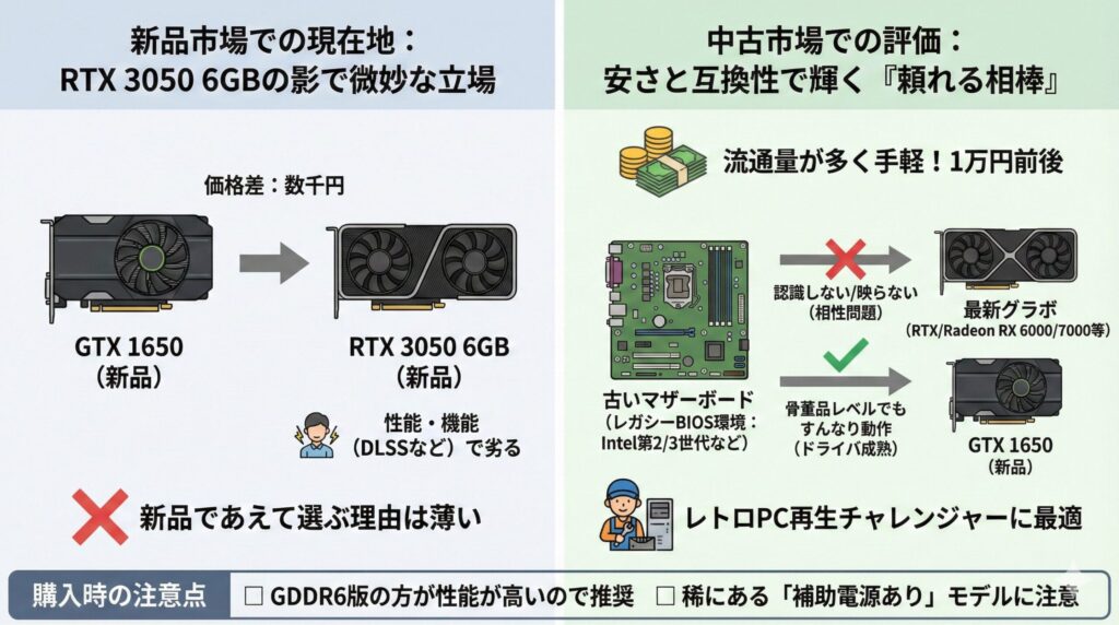 その点、GTX 1650は比較的古い世代の設計であり、ドライバも枯れて(成熟して)いるため、こうした骨董品レベルのPCでもすんなりと動作することが多いのです。「とにかく安く済ませたい」「相性問題のリスクを最小限にしたい」というレトロPC再生チャレンジャーにとっては、依然として頼れる相棒であることは間違いありません。ただし、購入の際は「GDDR6版」と「GDDR5版」があり、GDDR6版の方が性能が少し高いこと、そして稀に「補助電源あり」のモデルも混ざっていることに注意してください。