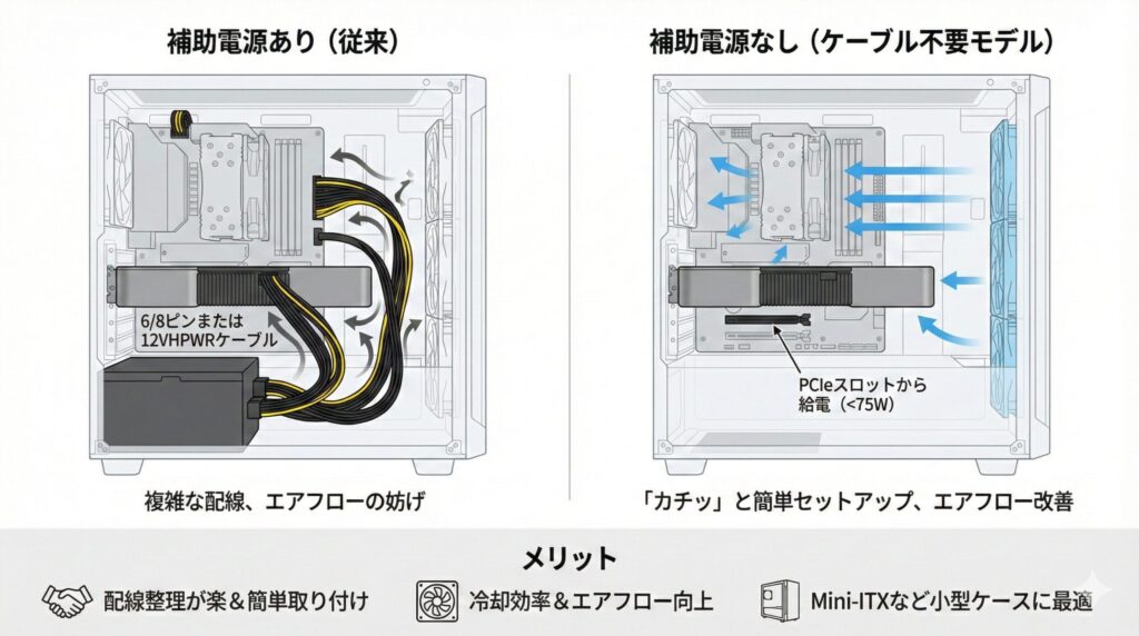 しかし、最近人気の「Mini-ITX」規格などの小型PCケースでは、内部スペースが極限まで切り詰められています。そこに太い電源ケーブルを通すとなると、CPUクーラーやケースファンに干渉したり、無理に曲げて接触不良のリスクを高めたりといったトラブルがつきものです。補助電源なしのモデルなら、マザーボードのスロットに「カチッ」と挿し込むだけで物理的なセットアップが完了します。面倒なケーブルマネジメントの悩みから一発で解放される快感は、一度味わうと病みつきになります。