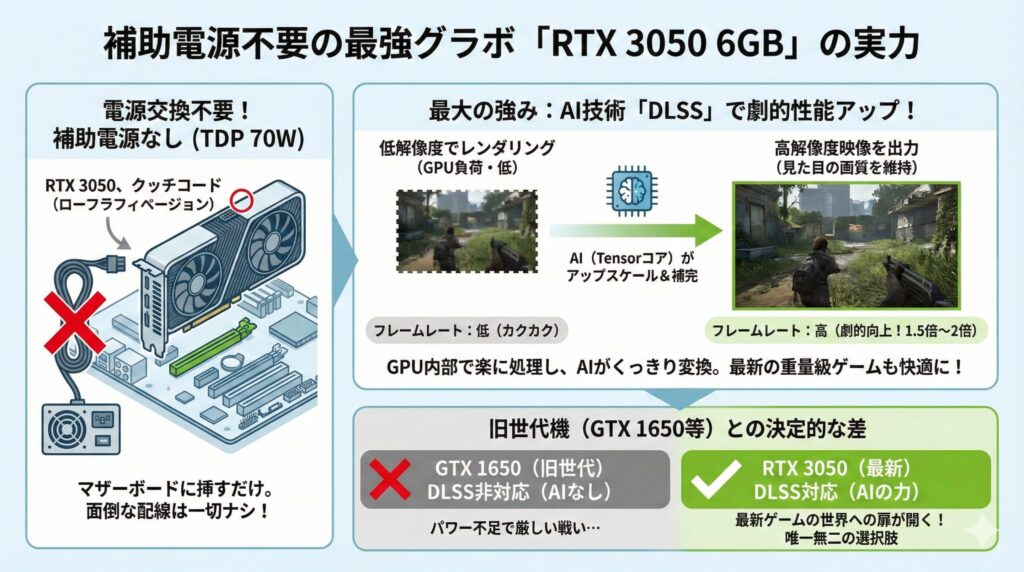 GTX 1650などの旧世代機(GTXシリーズ)は、このDLSSに対応していません。FSR(AMDの技術)などは使えますが、画質と安定性の面でまだDLSSに一日の長があります。この「AIの力」を使えるかどうかが、2025年のゲーミング体験における決定的な差となります。補助電源なしで、最新ゲームの世界への扉を開きたいなら、RTX 3050 6GBが唯一無二のパートナーになるはずです。