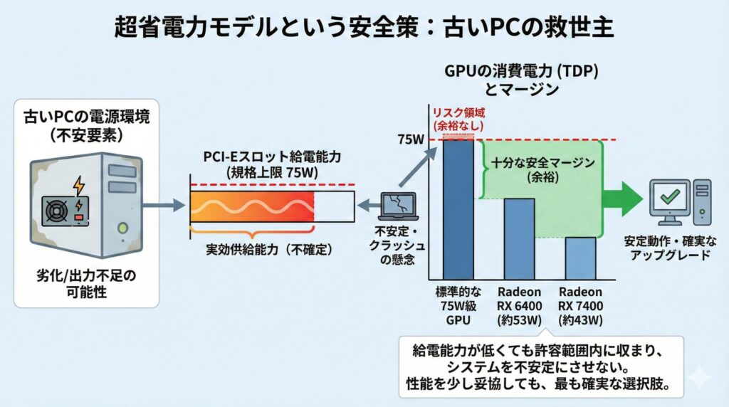 これらのカードは、規格上の上限である75Wに対して十分なマージン(余裕)を持っています。そのため、仮にマザーボードの給電能力が多少低かったり、電源ユニットが劣化していたりしても、許容範囲内に収まる可能性が高く、システムを不安定にさせることなく動作させることができます。「古いPCだし、高いパーツを買って動かなかったら怖い」という不安をお持ちの方には、性能を少し妥協してでも、これら「超」低消費電力モデルを選ぶことが、最も確実なアップグレードパスになると私は考えています。