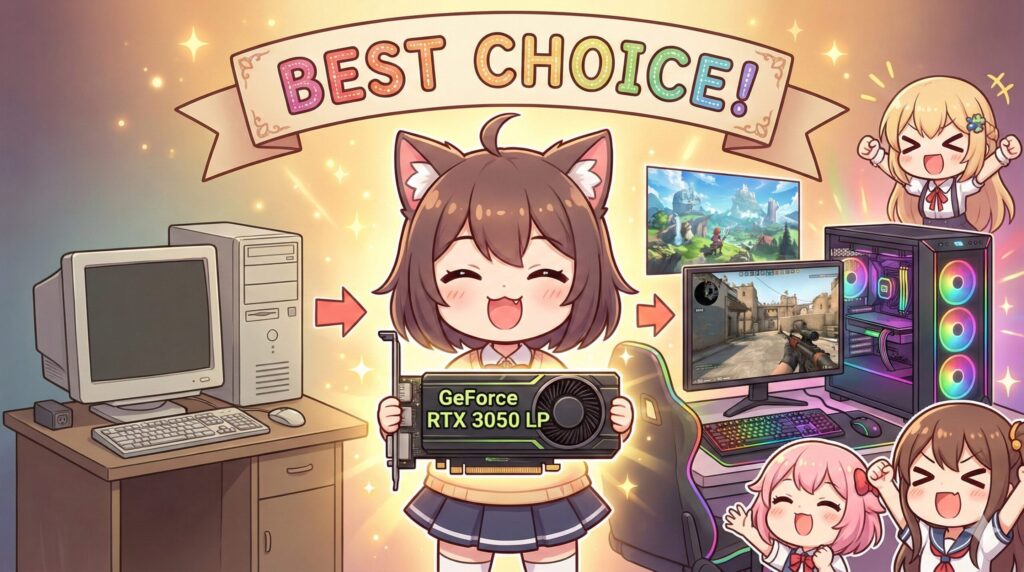 これが、最も多くの人にとって幸せになれる選択肢です。絶対的な演算性能ではRTX A2000に軍配が上がりますが、入手性、価格、静音性、ゲーム機能(DLSS)、そして配信機能(NVENC)のすべてを高いレベルで兼ね備えているのはRTX 3050 6GBしかありません。特に、古いPCユーザーが多いこの市場において、PCIeの世代を気にせずポテンシャルを発揮できる汎用性の高さは決定的な評価ポイントです。