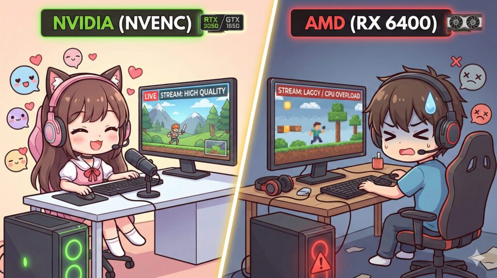 • RTX 3050 / A2000 / GTX 1650: これらのNVIDIA製GPUには「NVENC(NVIDIA Encoder)」という専用回路が搭載されています。これを使うと、ゲームの処理(CPU/GPU)とは別の回路で動画を圧縮するため、ゲームの重さにほとんど影響を与えずに高画質な配信・録画が可能です。特にRTX 3050とA2000に搭載されている第7世代NVENCは画質が非常に良く、プロのストリーマーも愛用するレベルです。