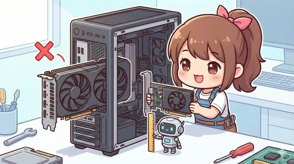 また、これらのカードの多くは冷却のURLためにファンを2つ搭載していたり、ヒートシンクが分厚かったりして「2スロット占有」となるのが一般的です。PC内部の拡張スロット周辺に、別のカード(Wi-Fiカードなど)やケーブルが干渉しないスペースがあるかどうかも、事前に定規で測って確認しておくことを強くおすすめします。
