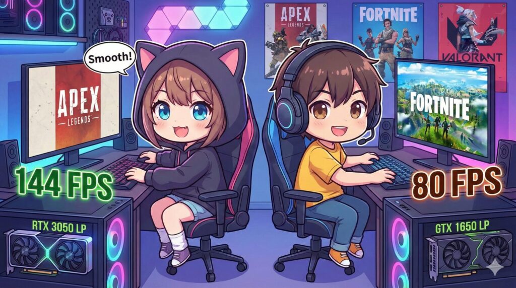 Apex Legendsの場合、RTX 3050 6GBを使えば、PS4やSwitchとは別次元の「ヌルヌル」した動きを体験できます。降下直後やテルミットグレネードが飛び交う重いシーンでも、フレームレートが安定しているため、エイム(照準)が敵に吸い付くような感覚を得られるでしょう。一方、GTX 1650でもプレイ自体は十分可能ですが、144Hzモニターを使って本気でランクマッチを戦うには、少しパワー不足を感じるかもしれません。