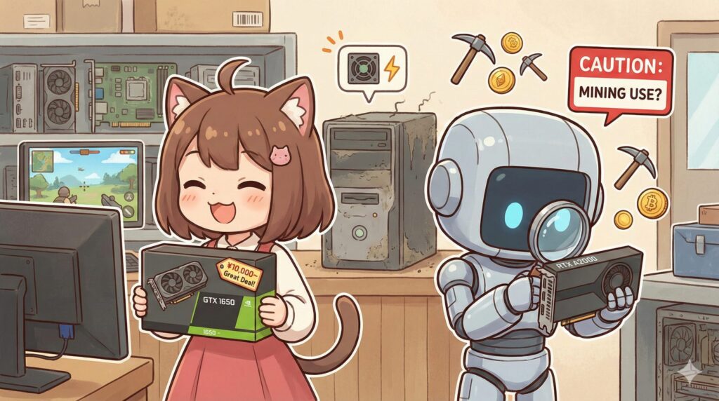一方で、中古のRTX A2000には少し注意が必要です。このカードは電力効率が極めて高いため、過去に暗号資産(仮想通貨)のマイニング用として大量に使われていた時期があります。中古市場に出回っている安いA2000(2万円台など)は、24時間365日フル稼働させられていた「酷使個体」である可能性が否定できません。ファンから異音がしたり、サーマルパッドから油が染み出していたりするリスクがあるため、購入時は信頼できるショップの保証付きを選ぶか、状態をしっかり確認する必要があります。