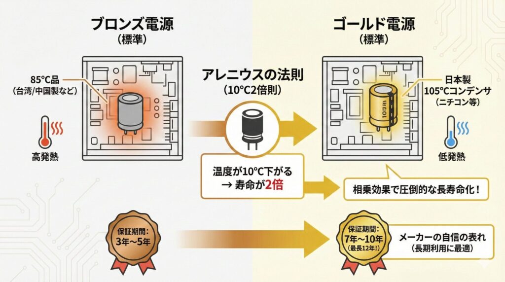 この相乗効果により、ゴールド電源はブロンズ電源に比べて、理論上の期待寿命が数倍になることも珍しくありません。