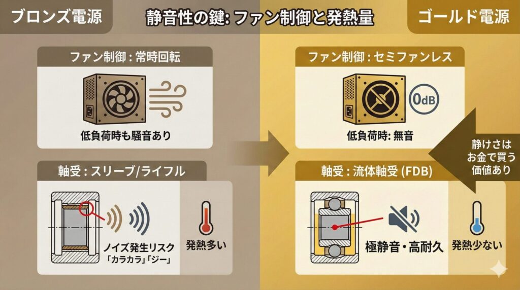 ブロンズ電源の場合、変換効率が低く発熱量が多いため、低負荷時でもファンを回し続けて排熱しなければならない設計の製品が大半です。たとえ低回転でも、ファンが回っていれば風切り音や軸音は発生します。