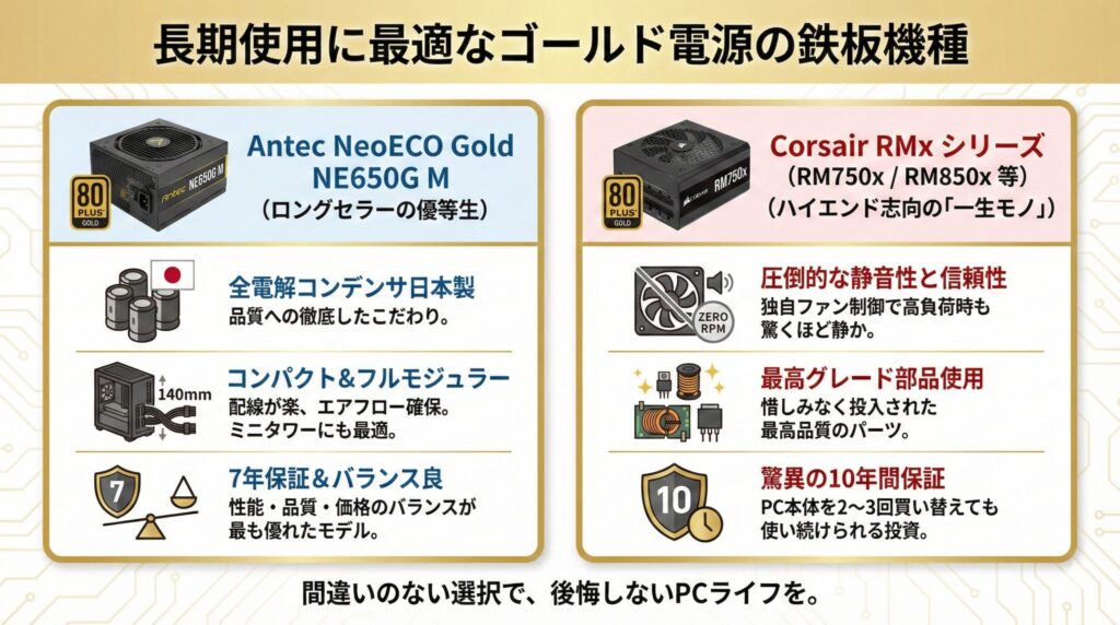 「長く使うメイン機だから、多少高くても間違いのないものが欲しい」という方には、以下のゴールド電源が鉄板です。これらを選んでおけば、まず後悔することはありません。