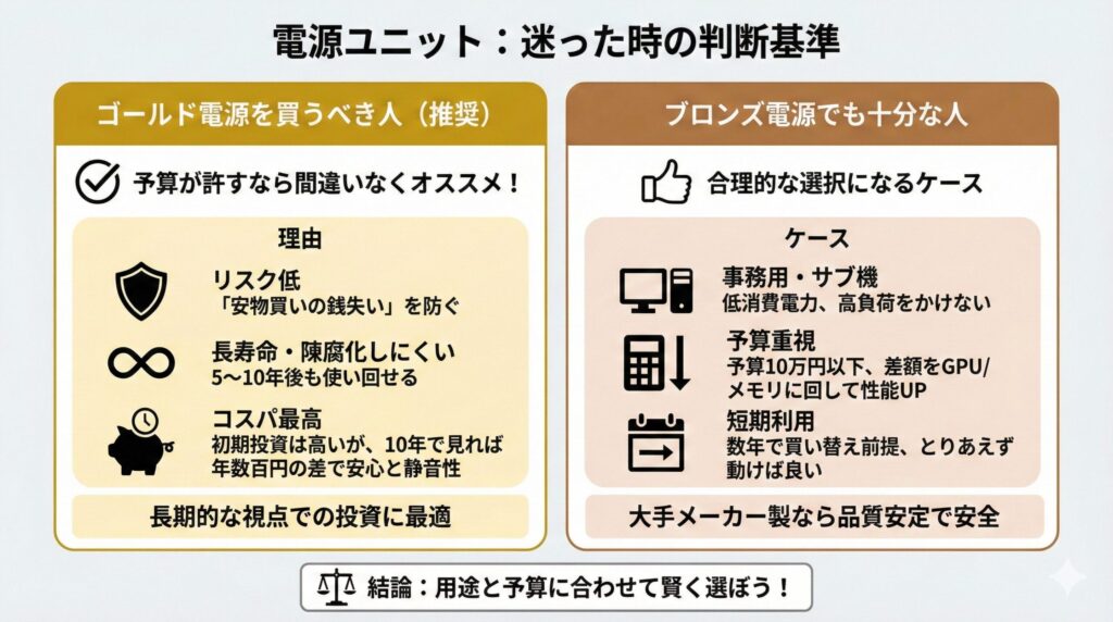 最近のブロンズ電源は、昔の「動物電源」と呼ばれたような粗悪品とは違い、大手メーカー製であれば品質も安定しています。「ブロンズだから危険」ということは決してないので、用途と予算に合わせて賢く選んでください。