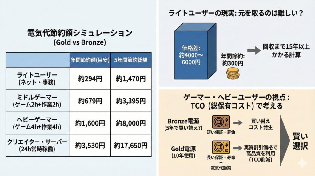 一方で、消費電力の大きいグラフィックボードを積んで毎日ゲームをするようなヘビーユーザーであれば、話は別です。年間1,500円〜2,000円近い差が出るため、3〜4年使えば価格差の半分以上は回収できます。