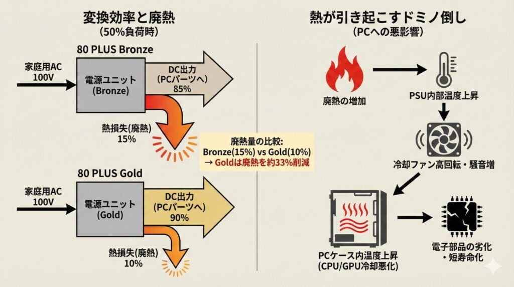 ブロンズ電源は入力電力の「15%」を熱として捨てていますが、ゴールド電源は「10%」で済みます。これを比率で計算すると、ゴールド電源を選ぶことで、ブロンズ電源に比べて廃熱(エネルギー損失)を約33%も削減できることになるのです。