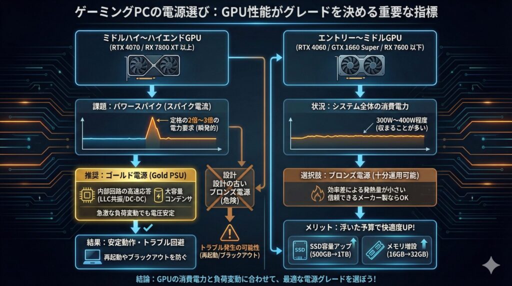 最近の高性能GPUは、平均消費電力とは別に、瞬発的に定格の2倍〜3倍もの電力を要求する「パワースパイク(スパイク電流)」が発生することがあります。ゴールド電源は、内部回路(LLC共振コンバータやDC-DC回路)の応答速度が速く、大容量のコンデンサを備えているため、こうした急激な負荷変動に対しても電圧を安定させることができます。