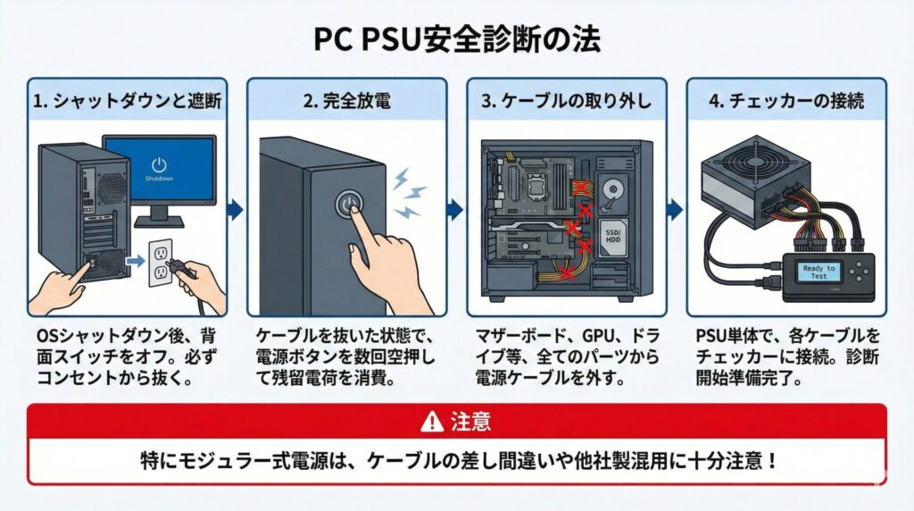 - 電源ユニットチェッカーを使った正しい故障診断の手順と安全な準備