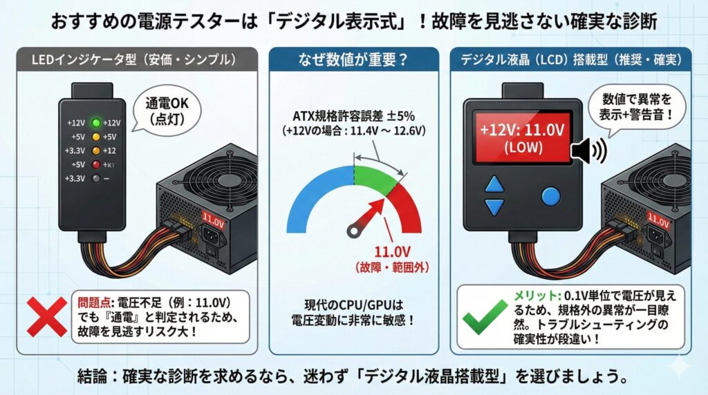 これでは故障を見逃してしまいますよね。対して、デジタル表示式であれば、液晶画面に「11.0V」という数値がハッキリと表示され、さらに警告音で異常を知らせてくれます。「正常か異常か」の境界線がシビアなPCパーツだからこそ、0.1V単位で数値が見えるデジタル式を使うことで、トラブルシューティングの確実性が段違いに上がります。