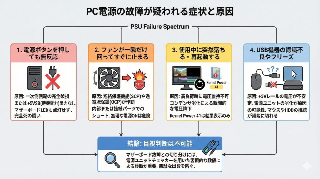PCのトラブルシューティングにおいて、電源ユニット(PSU)はシステムの「心臓部」であるがゆえに、不調のサインも多岐にわたります。「電源が入らない」=「電源ユニットの故障」と短絡的に考えがちですが、実際にはもっと複雑な症状を示すことが多いのです。私がこれまでの自作PCライフや修理経験の中で、「これは十中八九、電源ユニットが怪しいな」と感じる代表的な症状と、その技術的な背景を深掘りしてみましょう。