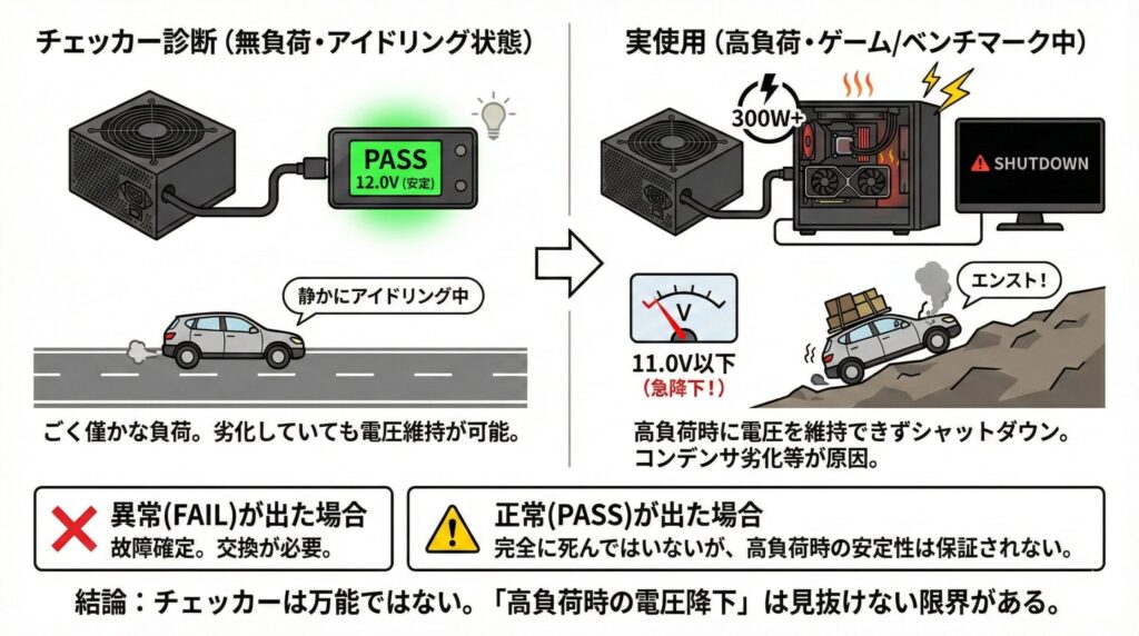 ここまでチェッカーの有用性を語ってきましたが、ここで一つ、非常に重要な「不都合な真実」をお伝えしなければなりません。それは、「チェッカーで全項目正常(Pass)が出ても、電源ユニットが100%正常とは言い切れない」ということです。