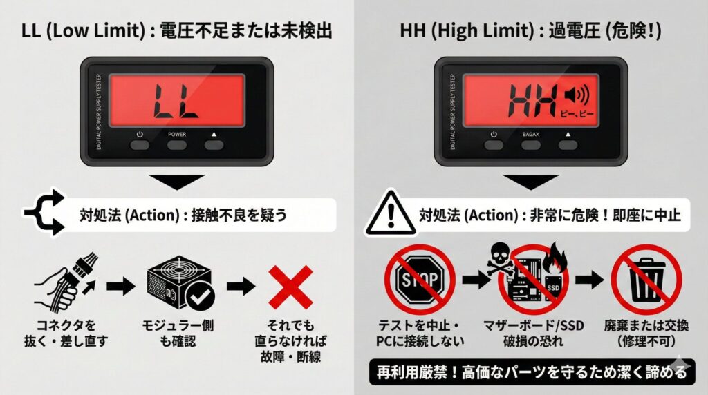 - HH (High Limit): 過電圧電圧が規定値(上限)を超えている状態です。例:12Vラインに13V以上流れているなど。