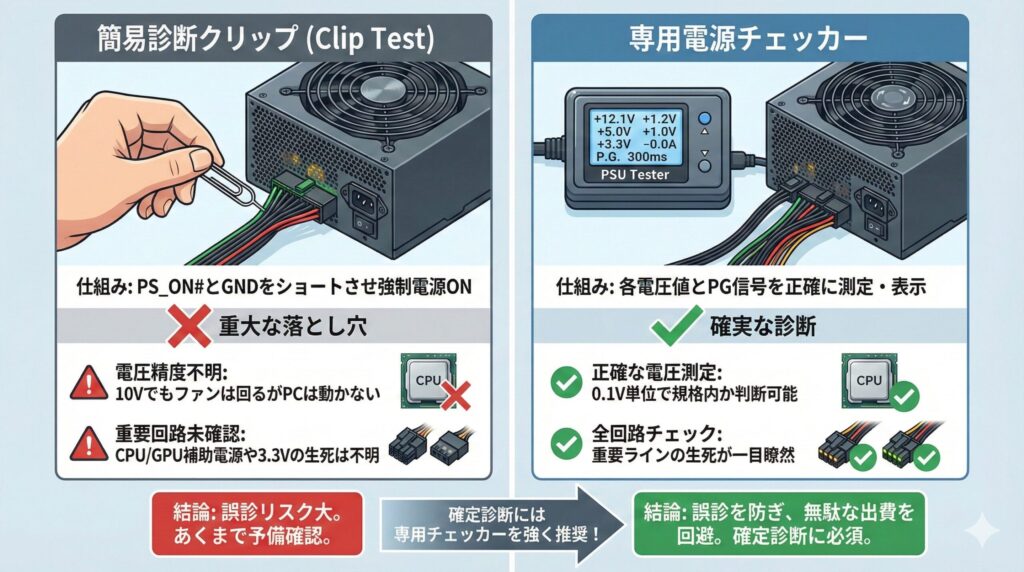 つまり、クリップテストでファンが回ったことに安心して「電源は大丈夫だ、ならマザーボードが壊れたんだ!」と早合点し、高価なマザーボードを買い替えてしまった結果、実はやっぱり電源の電圧不足が原因だった…という悲劇が後を絶ちません。こうした「誤診」による無駄な出費や労力を防ぐためにも、電圧値が見えないクリップテストはあくまで予備的な確認にとどめ、確定診断には必ず専用のチェッカーを使用することを強く推奨します。