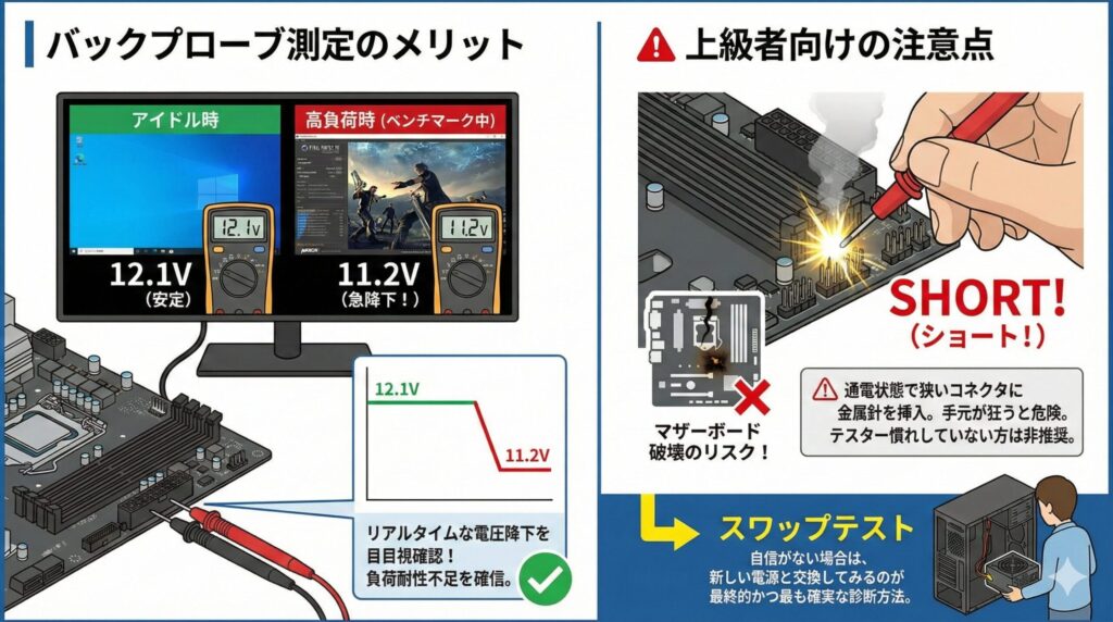 ただし、この方法はPCを通電させた状態で狭いコネクタに金属の針を差し込むため、手元が狂って隣のピンと接触させるとショートしてマザーボードを破壊するリスクがあります。テスターの扱いに慣れていない方には推奨しません。