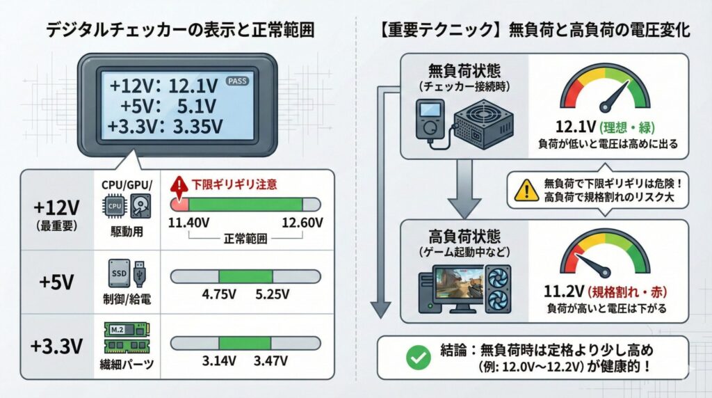 電気の特性上、負荷(使用電力)が高くなればなるほど、電圧は下がる傾向にあります。つまり、チェッカーをつないだだけのアイドル状態で、+12Vラインの表示が「11.4V」や「11.5V」といった下限ギリギリの数値を示している場合、実際にゲームを起動してGPUが200Wもの電力を消費し始めたら、間違いなく11.4Vを下回って規格割れを起こします。