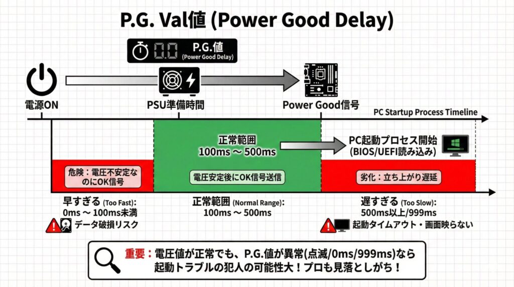 電圧値と同じくらい、あるいはトラブルシューティングにおいてはそれ以上に重要なのが、画面の隅(多くの場合左下など)に表示される「P.G.」という数値です。これは「Power Good Delay」の略で、PCの起動プロセスに関わる非常に重要な指標です。