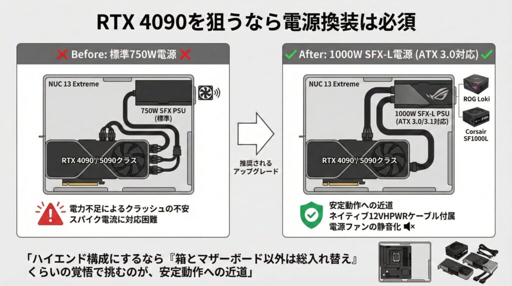 もしNUC 13 ExtremeでRTX 4090、あるいは将来のRTX 5090クラスの運用を本気で考えているなら、標準の750W電源に見切りをつけることを強く推奨します。市場には、ASUS ROG LokiやCorsair SF1000Lといった、1000WクラスかつATX 3.0/3.1対応(ネイティブ12VHPWRケーブル付属)のSFX-L電源が存在します。これらに換装することで、電力不足によるクラッシュの不安を一掃できるだけでなく、電源ファンの静音化にも繋がります。