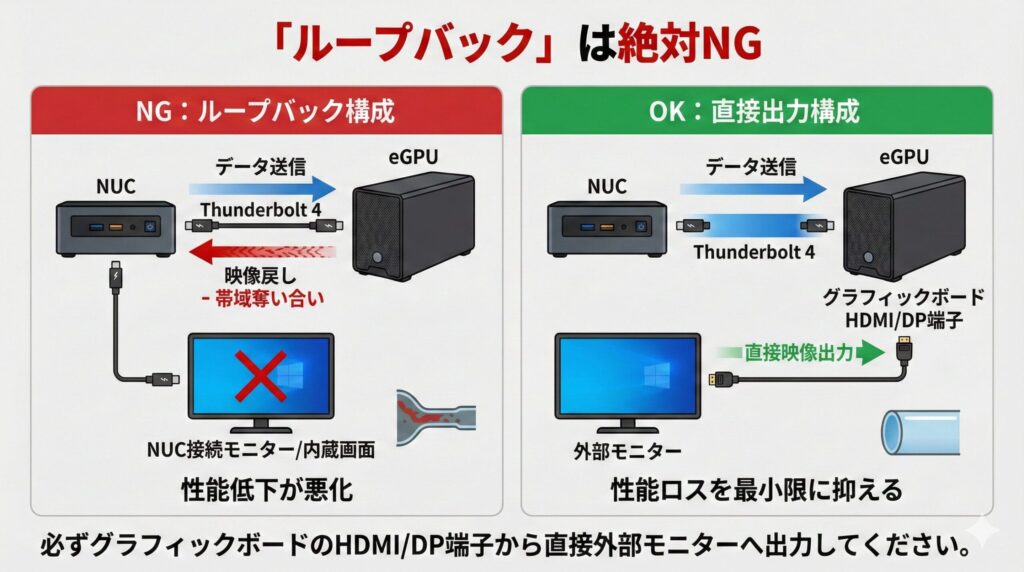初心者がやりがちなミスとして、eGPUで処理した映像を、Thunderboltケーブルを介してNUCに戻し、NUCに繋いだモニター(またはノートPCの内蔵画面)に表示させる「ループバック」があります。これを行うと、ただでさえ狭い帯域を行きと帰りで奪い合うことになり、性能低下がさらに悪化します。eGPUを使用する際は、必ずグラフィックボードのHDMI/DP端子から直接外部モニターへ出力してください。これだけで性能ロスを最小限に抑えられます。