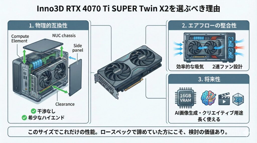 • NUC 11/12 Extremeユーザー(最強を目指す人):迷わず「Inno3D GeForce RTX 4070 Ti SUPER Twin X2」を探してください。これが物理的干渉なしに搭載できる性能の上限値であり、NUCの寿命を数年延ばす最高の投資になります。