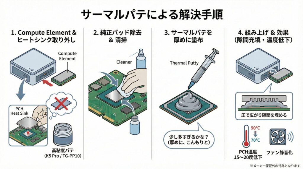 このままでは、PCHが高温になりすぎてシステム全体のパフォーマンスが制限されたり、USB接続機器の動作が不安定になったりする恐れがあります。そこで、多くのパワーユーザーが実践しているのが「サーマルパテ(Thermal Putty)」による改修です。