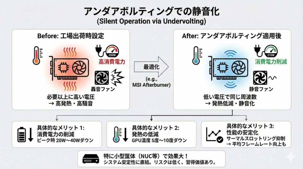 NUC内部にGPUを搭載する場合も、eGPUボックスを使用する場合も、共通して言えるのが「熱と騒音」の悩みです。限られたエアフローの中でGPUがフルパワーで稼働すると、ファンは轟音を上げ、排熱が追いつかずにクロックダウンすることもあります。そこで、ハードウェアの改造なしに劇的な効果を得られるテクニックが「アンダアボルティング(Undervolting)」です。
