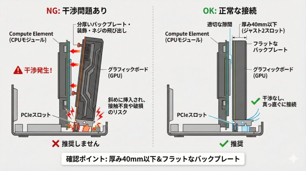 一部のハイエンドカードに見られるような、冷却効果を高めるための分厚いバックプレートや、デザイン重視の立体的な装飾、あるいは単なるネジの頭の飛び出しでさえも、Compute Elementの樹脂カバーと干渉します。これにより、GPUがPCIeスロットに対して斜めに力がかかった状態で挿入されることになり、電気的な接触不良やスロット破損の原因となるケースが報告されています。