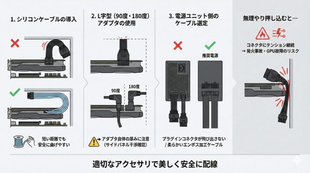 無理やりケーブルを押し込んでサイドパネルを閉じると、コネクタに常にテンションがかかり続け、最悪の場合は発火事故やGPUの故障につながります。ここは時間をかけてでも、適切なアクセサリを用意して美しく配線すべきポイントです。