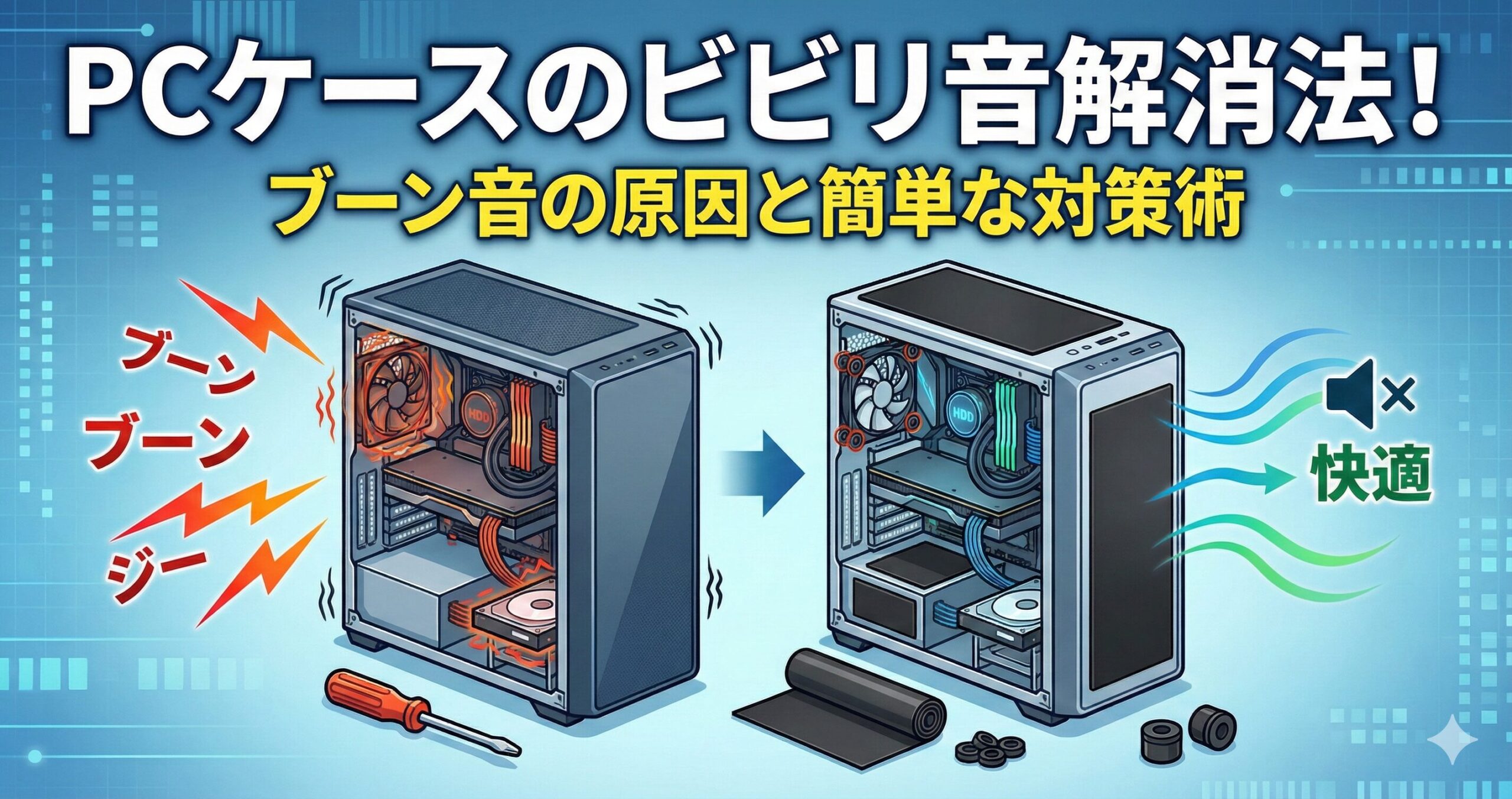 PCを使っていると、ふとした瞬間に「ブーン」という低い音や「ジー」という耳障りな音が気になり出したことはありませんか。せっかく集中しているのに、PCケースのビビリ音や異音のせいで気が散ってしまうのは本当にもったいないですよね。実はこれらの音は、ファンの振動やHDDの回転がケースと共振することで発生していることが多いんです。強化ガラスのパネルや防振対策が不十分な場合にも起こりやすいこの問題ですが、原因さえ分かれば意外と簡単に対処できます。この記事では、私が実際に試して効果があった対策を中心に、物理的な改善策からファン設定による制御まで幅広く紹介していきます。